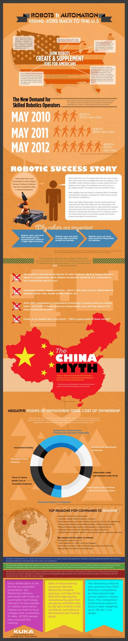 Check out our infographic below and you’ll see the many ways in which robotics and the reshoring initiative can help increase manufacturing employment in the U.S. From providing improved safety measures in dangerous jobs, to introducing higher-paying, specialized positions that workers can be trained to fill, to laying out the true pros and cons of offshore outsourcing, this infographic sheds some light on the “other side” of the story.