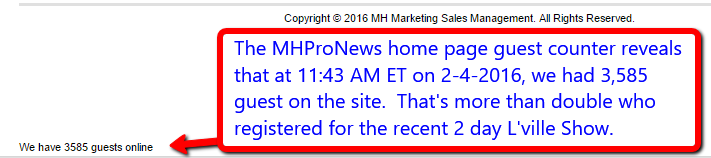 One reason MHProNews and MHLivingNews dominate in their respective categories is because we practice what we preach. We generate daily, relevant content on MHProNews. The result? At the time I’m doing this blog, here is how many people our home page guest tracker says are on our site, “We have 3585 guests online.”