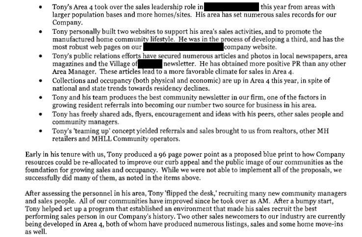 The above is an excerpt from a longer letter signed by the president of a well known land-lease portfolio operator. That president asked that we share the letter in full only upon request, so we've blacked out from the above 'clues' as to who the company is. We also have third party references on this same project that confirmed the dramatic turn-around results described in the letter above.