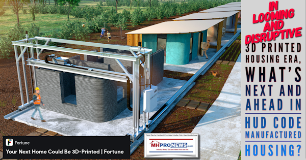3D-printed housing is perhaps the leading technological advance that is likely to upend several aspects of conventional and HUD Code manufactured home building. As a new article linked here noted, 3D-printed housing – once systematically deployed – is expected to come in at about 20-25 percent lower in cost than conventional construction. That means that the Clayton Homes-backed Manufactured Housing Institute (MHI) initiative dubbed CrossModTM homes are apparently going to die; the only question is ‘when’ they are quietly buried. That CrossMods funeral was predicted years ago, based upon the evidence of other previously failed but once-touted Clayton projects. CrossMods never had any of the market traction MHI and its proponents claimed. More on that linked here.
