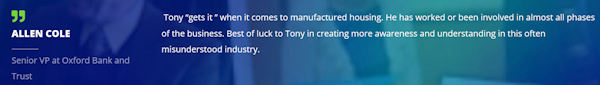 First-time readers here might note that this is a marketing and sales blog focused on manufactured housing. Newer readers might also familiarize yourself with the experience of the writer and what literally scores of third parties have said about our pro-industry and pro-growth work (see link below Al Cole’s kind quote, below).