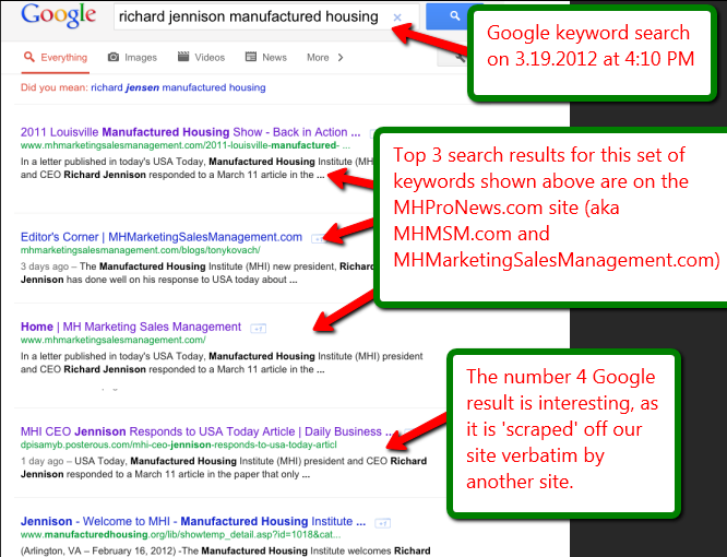 A picture or a graphic is worth a thousand words. An example of a topic we wanted to get good SEO on was the Manufactured Housing Institute's (MHI) new President and CEO, Richard A. “Dick” Jennison. Please notice that while USA Today – where Jennison recently had published a short article – has a far broader circulation than all the manufactured housing publishers combined, we managed to snag the top spot on page 1 for the keyword set shown below. We also managed to edge out MHI on the ranking for this same topic.
