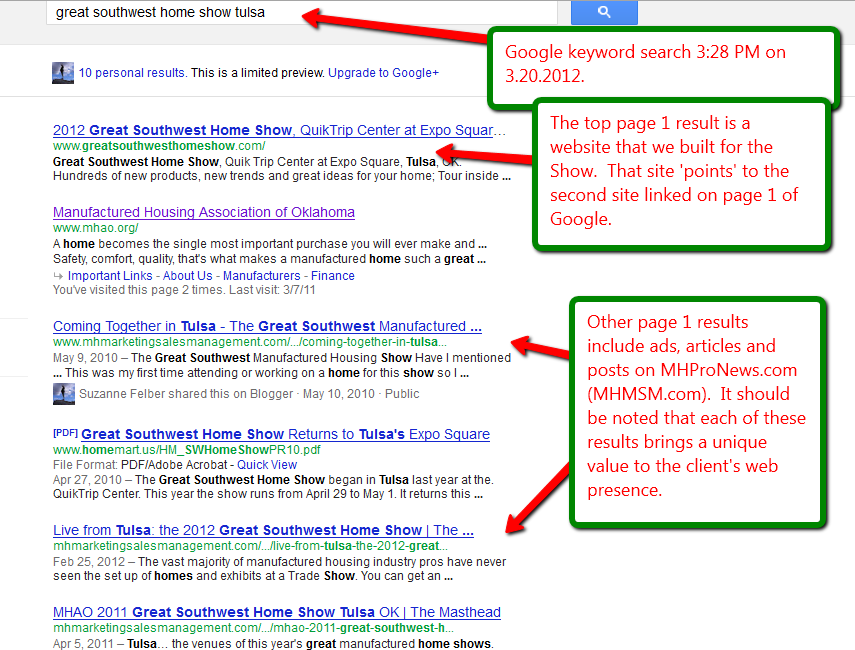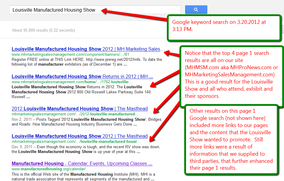 Another example is the Louisville Manufactured Housing Show. We dominated the page 1 of Google on this subject, as you can see in the graphic below.