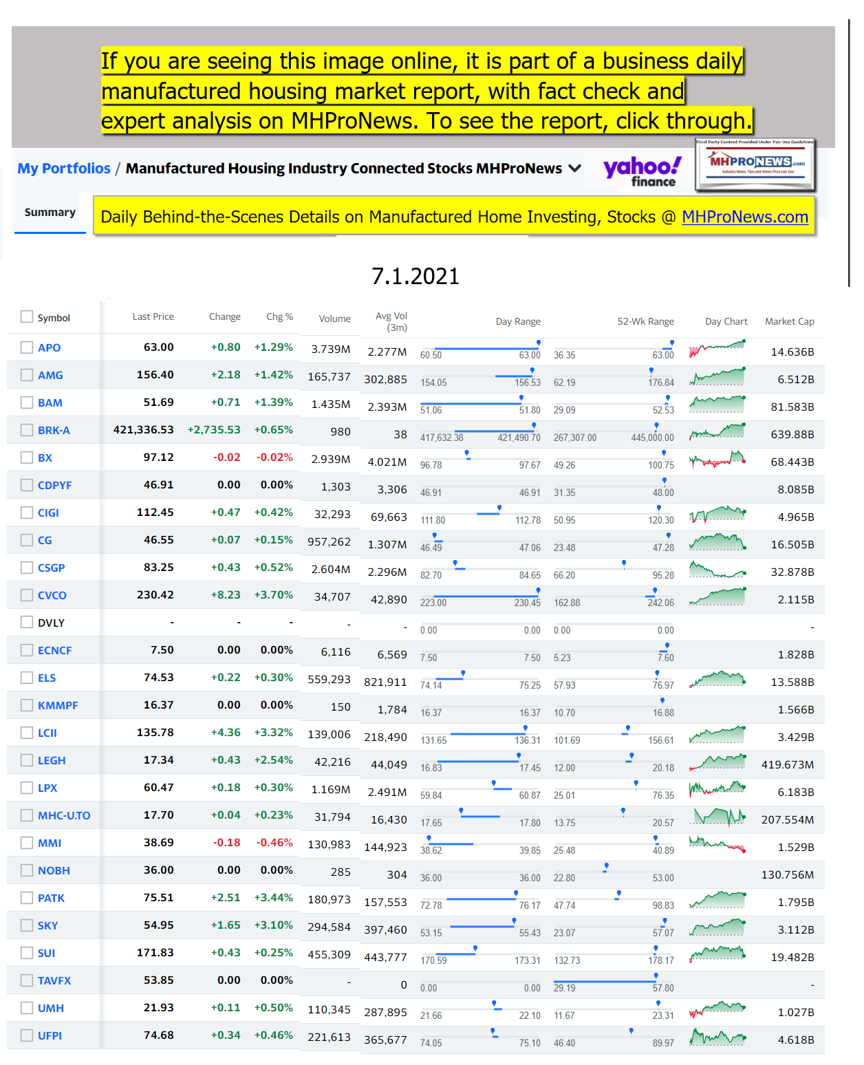 Berkshire Hathaway is the parent company to Clayton Homes, 21st Mortgage, Vanderbilt Mortgage and other factory built housing industry suppliers. · LCI Industries, Patrick, UFPI, and LP each are suppliers to the manufactured housing industry, among others. · AMG, CG, and TAVFX have investments in manufactured housing related businesses. For insights from third-parties and clients about our publisher, click here. Enjoy these ‘blast from the past’ comments.
