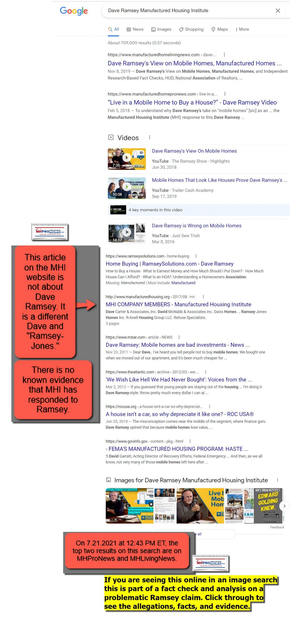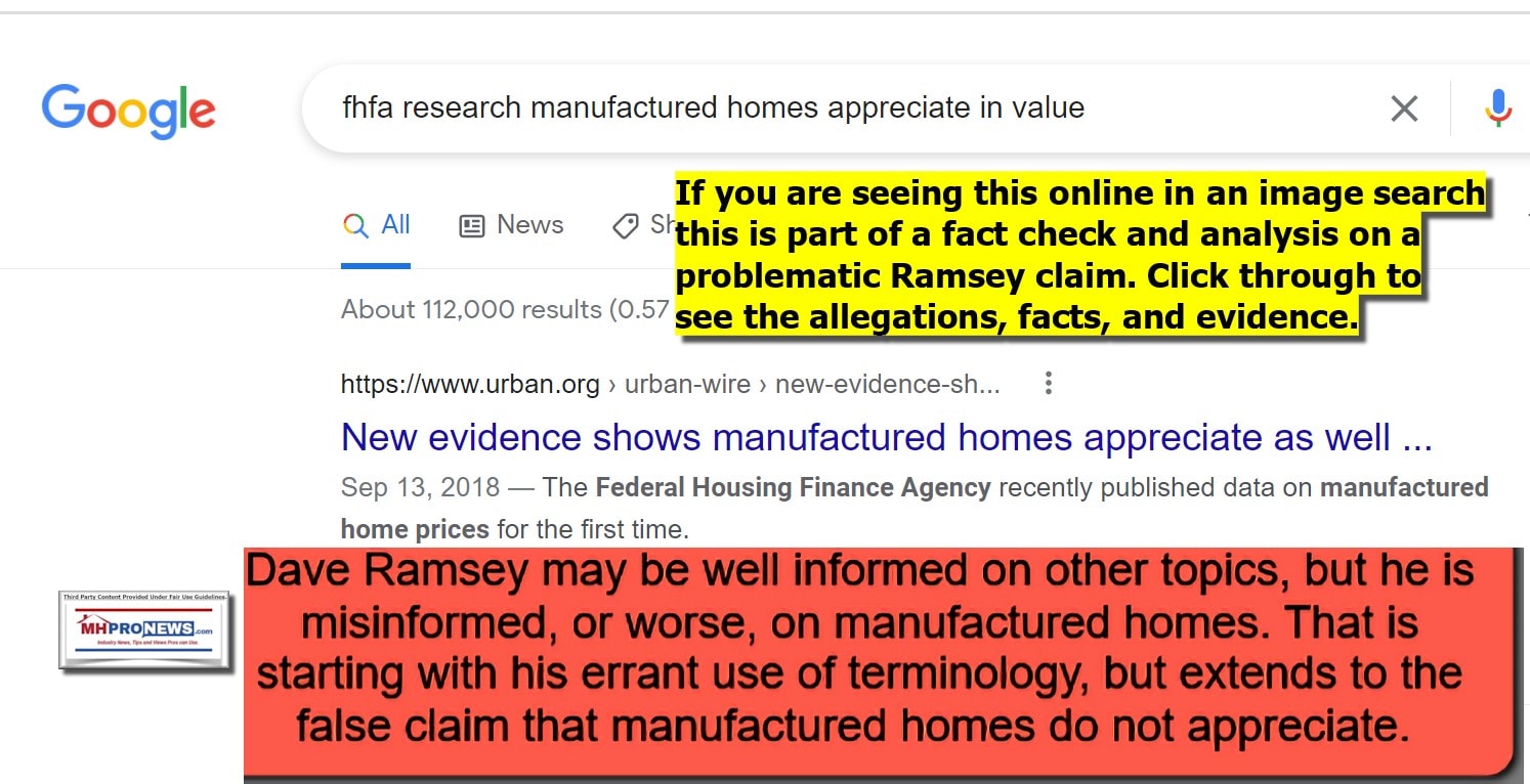 Because it is related, it is worth noting that one of the top 10 articles accessed this month on the MHLivingNews website has to do with our report on the fact-check, analysis, and commentary on Dave Ramsey’s arguably flawed – and errantly described – claim that “mobile homes” are not a good investment. Even the image used by Ramsey in that video below reflects either ignorance, bias, or something other than an understanding of the objective facts about modern manufactured homes. Ramsey may be smart on many things, but is demonstrably wrong about his statements on this topic.