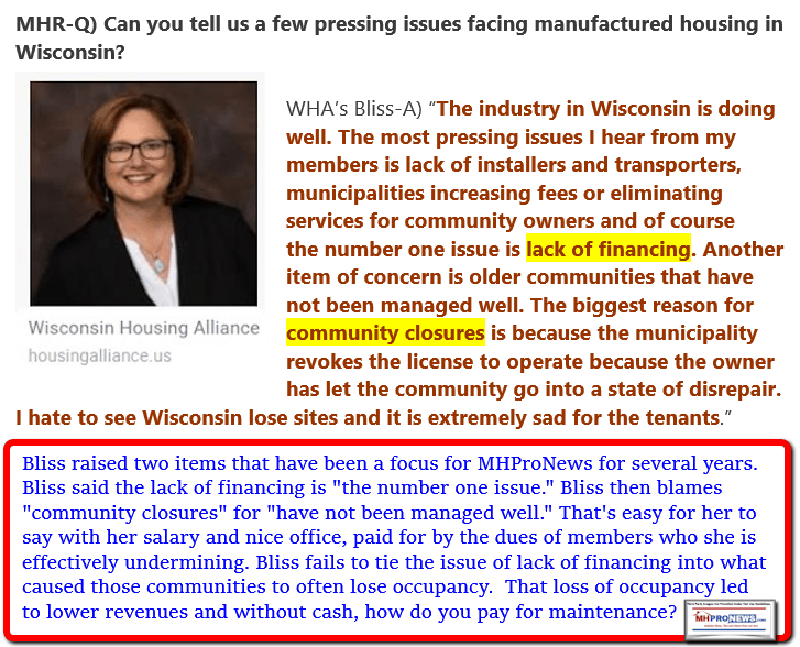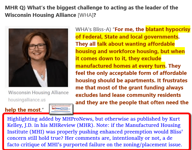 The problems with zoning and placement were highlighted, as was noted in the report above, by a recent MHI so-called news item to their members and readers. It was focused on questions posed by congressional representatives to HUD Secretary Marcia Fudge. But when that CSPAN provided source video to that self-congratulatory MHI news statement was examined, there was nothing good there from the vantagepoint of the concerns raised by Gaiski, Bliss, or others that have been previously quoted by MHProNews and/or MHLivingNews. Instead, it boiled down to fairly short exchange where Fudge pushed back on the very things that MHI claims to be working to achieve.