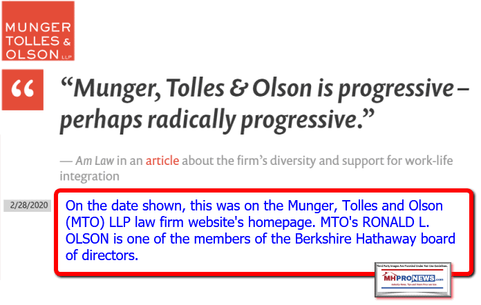It should be noted that the Berkshire board includes two attorneys, including Berkshire Hathaway Vice-Chair, Charlie Munger, that proudly proclaim themselves to be radically progressive. The quote below was emblazoned on their website.