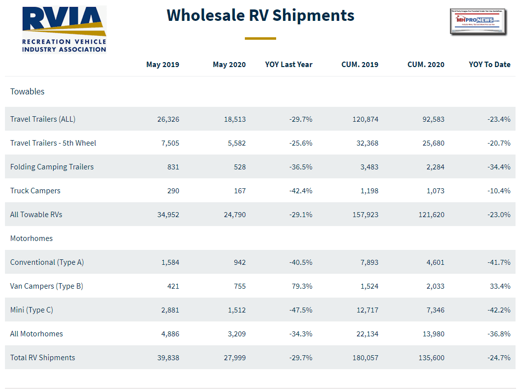 Graphic from RVIA. Note that most RVs sold in May 2020 were towable RVs as opposed to motorized RVs. Subtract the total on the left from the towable RV totals on the right to discover how many motorized RVs were sold. The vast majority of RVs sales are towable units.