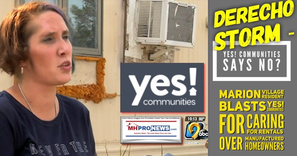 “I feel neglected,” Christina Mullins, of Marion, Iowa said to ABC affiliate KCRG 9. “I feel left behind. I feel that we are being forgotten and swept under the rug.” Mullins Lives in Marion Village, in Marion, Iowa near Cedar Rapids. The Yes! Communities website identifies Marion Village as one of their land-lease communities. Mullins says management, including their corporate office, has failed to assist resident homeowners, while purportedly caring for corporate owned rental units in the wake of the derecho earlier in the month.