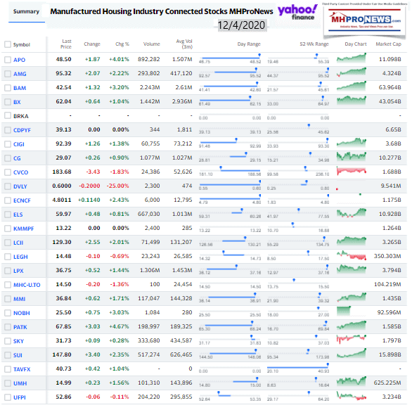 Manufactured Housing Industry Investments Connected Closing Equities Tickers