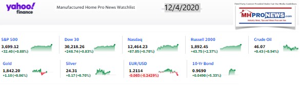 This evening’s featured focus will be 5 short items from the White House press room today. Four of the give have business implications. For our growing number of new readers, that featured focus segment of our business nightly report is found after the quotable quotes, left-right headline bullets, and two of our three market summary graphics at the closing bell today. The manufactured housing connected equities today are found following the featured focus and recent/related report links.