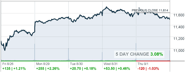 CNNMoney reports that the Dow slipped back into negative territory today. The Dow closed at 11,493.57 -119.96 -1.03%, off -0.73% year to date. Headlines included Goldman Sach’s slap on robo-signing, the White House’s ‘slower jobs recovery’ statement and the IRS giving a break to those impacted by Hurricane Irene. Yahoo! Financial’s Manufactured Housing Composite index value slid -4.00% to close at 833.0. Affiliated Managers Group 84.73 -2.43 (-2.79). Clayton Homes, Vanderbilt Mortgage & Finance and other HUD Code home builders, lending and housing supplier parent company, Berkshire Hathaway 107,228.00 -2,541.00 (-2.31%). Cavco Industries 35.12 -1.25 (-3.44%). Champion, Deer Valley and Liberty Homes were all unchanged. Nobility Homes 7.19 -0.26 (-3.49%). Patrick 1.92 -0.09 (-4.48%). Palm Harbor Homes Inc. 0.01 +0.0030 (+42.86%). Skyline Corporation 10.29 -0.63 (-5.77%). Sun Communities 37.43 -1.11 (-2.88%). TAVFX (Aug 31) 46.59 +0.60 (+1.30%). UMH Properties 9.03 -0.21 (-2.27%). UFPI 28.28 -2.28 (-7.46%).