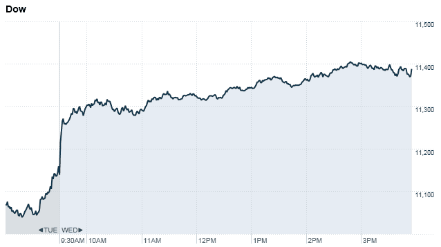 CNNMoney reports that the Dow rallied today to close at 11,414.86. +275.56 (+2.47%). The Manufactured Housing Composite Value: 848.0 +4.67%. Affiliated Managers Group 85.31 +5.02 (6.25%). Clayton Homes, Vanderbilt Mortgage and Finance and other MH builders, lending and housing suppliers parent company Berkshire Hathaway 106,120.00, +3,545.00 (+3.46%). Cavco Industries 35.71 +1.64 (4.81%). Champion, Deer Valley, Liberty, Nobility and Palm Harbor unchanged. Drew Industries 20.03 +0.90 (4.70%). Equity Lifestyle Properties 70.29 +2.49 (+3.67%). Sun Communities 38.44 + 1.40 (3.78%). Third Avenue Value Fund (9.6) 44.40 -0.84 (-1.86%). UMH Properties 9.19. + 0.26 (2.91%) Universal Forest Products, Inc. 28.51 +1.60 (+5.95%).