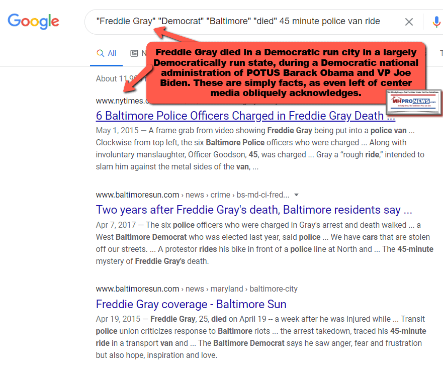 Then, “On April 12, 2015, Freddie Carlos Gray Jr., a 25-year-old African-American, was arrested by the Baltimore Police Department,” says Wikipedia. Baltimore is a Democratically run city, in what at the time was a Democratically run state during the Democratic Obama-Biden Administration. Republicans had nothing to do with the tragic death of a black man that died during a 45-minute ride in the back of a police van in a Democratically run city and state. Who says? These are facts that even pro-Democratic media such as the New York Times acknowledges.
