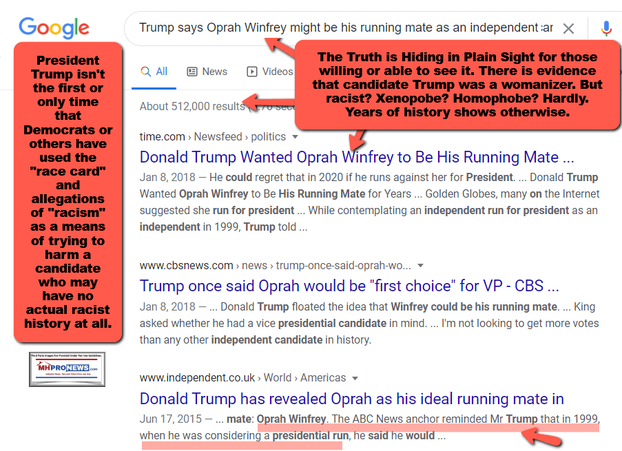 If President Trump is seriously a racist and a xenophobe, then why was private citizen Trump doing deals not only in the U.S. but nations around the world? Why is there such a lack of evidence of racism in his history? After all, candidate Trump in 2015 was reminded by ABC News that he floated the idea in 1999 of Oprah Winfrey – the famous black entertainer and billionaire – of being his running mate. Winfrey and Trump were seen together multiple times. Was that racism, or its opposite?