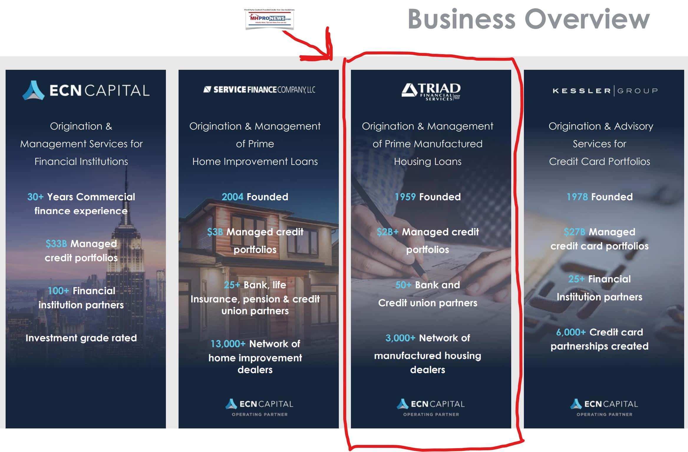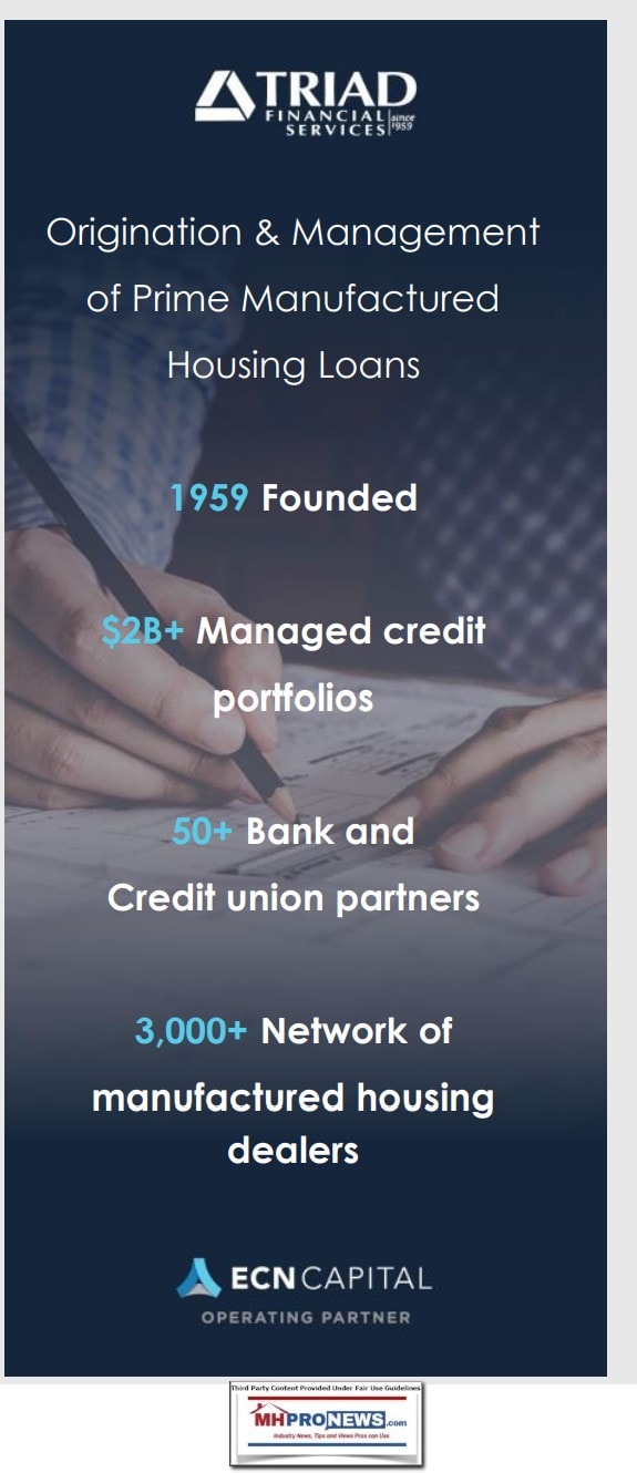 But a look at the 2020 Clayton Homes report linked above, compared to what will be seen from ECN’s latest facts on Triad Financial Services [Triad or TFS) below, arguably paints a story in significant contrasts.