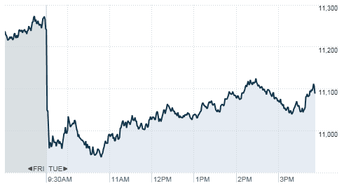 9.6.2011_RealTick_CNNMoney CNNMoney reports that the Dow Jones Industrial Average closed at 11,139.30,  -100.96 ( -0.90%).  While the initial fall was worse, stocks rallied later in the day.  The Yahoo! Financial Manufactured Housing Composite Index bucked that trend and rose today, 810.2 up +0.46%. Affiliated Managers Group, 79.01 -1.28 (-1.60%). Clayton Homes, Vanderbilt Mortgage and Finance and other manufactured and modular building, lending and housing supplier parent company Berkshire Hathaway  102575.00 -1425.00‎ (-1.37%‎).  Cavco Industries 34.07 +0.12 (+0.35%). Champion, Deer Valley, Liberty Homes and Palm Harbor remained unchanged. Drew Industries 19.13 +0.59‎ (3.18%‎). Equity Lifestyle Properties 67.80 -0.06‎ (-0.09%‎).  Nobility Homes 7.60 -0.01 (-0.13%).  Skyline Corporation 9.73 +0.10 (+1.04%). Sun Communities 37.04 +0.52 (+1.42%). Third Avenue Value Fund (Sep 2)  45.24 -1.15 (-2.48%). UMH Properties, 8.94 +0.01 (+0.11%). Universal Forest Products, Inc. : 26.31 -0.60 (-2.24%).