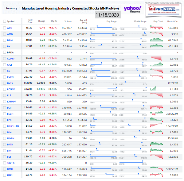 Manufactured Housing Industry Investments Connected Closing Equities Tickers