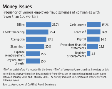 WSJ reports that employee fraud – from check-forgery, petty cash to billing larceny schemes – often rises in tough economic times. Employees feeling financial pressure often fuels the problem. Small companies are especially vulnerable because they often lack stringent internal controls to prevent fraud. Managers may attribute lost funds to lower sales, never suspecting foul play. “A lot of times a small business will close its doors, and may never know they were defrauded — that the problem wasn’t a declining economy, that employees were stealing,” says James D. Ratley, president of the Association of Certified Fraud Examiners, an antifraud trade group based in Austin, Texas. Jeffrey Sklar, a partner at Bellmore, N.Y., accounting firm Sklar, Heyman & Company LLP, says “Desperate people do desperate things.” Sklar says business owners should watch employees who seem to live beyond their means. Employees guarding access to accounting software or who never take a vacation should also raise suspicion. Business owners should review every canceled check and look at the signature on the back. They should review bank statements each month and check for unusual transfers. Once a business owner discovers alleged fraud, a quiet approach is recommended, drawing on an accountant and attorney’s help. Most employees are ashamed and agree to a deal to avoid prosecution, Mr. Sklar says. The chart attached reflects some of the types of potential fraud that should be monitored.