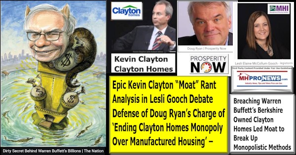 Entirely missing from the ‘debate’ between Doug Ryan and Lesli Gooch via American Banker about Ryan’s charge that Berkshire Hathaway owned Clayton Homes has a monopoly over manufactured housing was any mention of three key pieces of evidence. That evidence? 1) CEO Kevin Clayton of Clayton Homes video interview and related transcript where he explains the “castle and moat” methodology as taught by Warren Buffett. Kevin’s ‘rant’ or discourse flatly stated that the Buffett “moat” is designed to create “a durable competitive advantage” that defeats competitors over time. 2) Any specific mention by either Ryan or Gooch of Ryan’s obvious need for a conflict-of-interest disclaimer. Why was a disclaimer needed? Because CFED-turned Prosperity Now financially benefits from Buffett-led-Berkshire bucks via documented channels. That ‘missed disclosure’ opens the door to questioning the authenticity of their ‘debate.’ 3) An authentic examination of how the Berkshire brands use “the Iron Triangle” and so-called “sabotage monopoly” methods in a manufactured housing described by Federal Reserve researcher James Schmitz Jr in conjunction with his collogues.