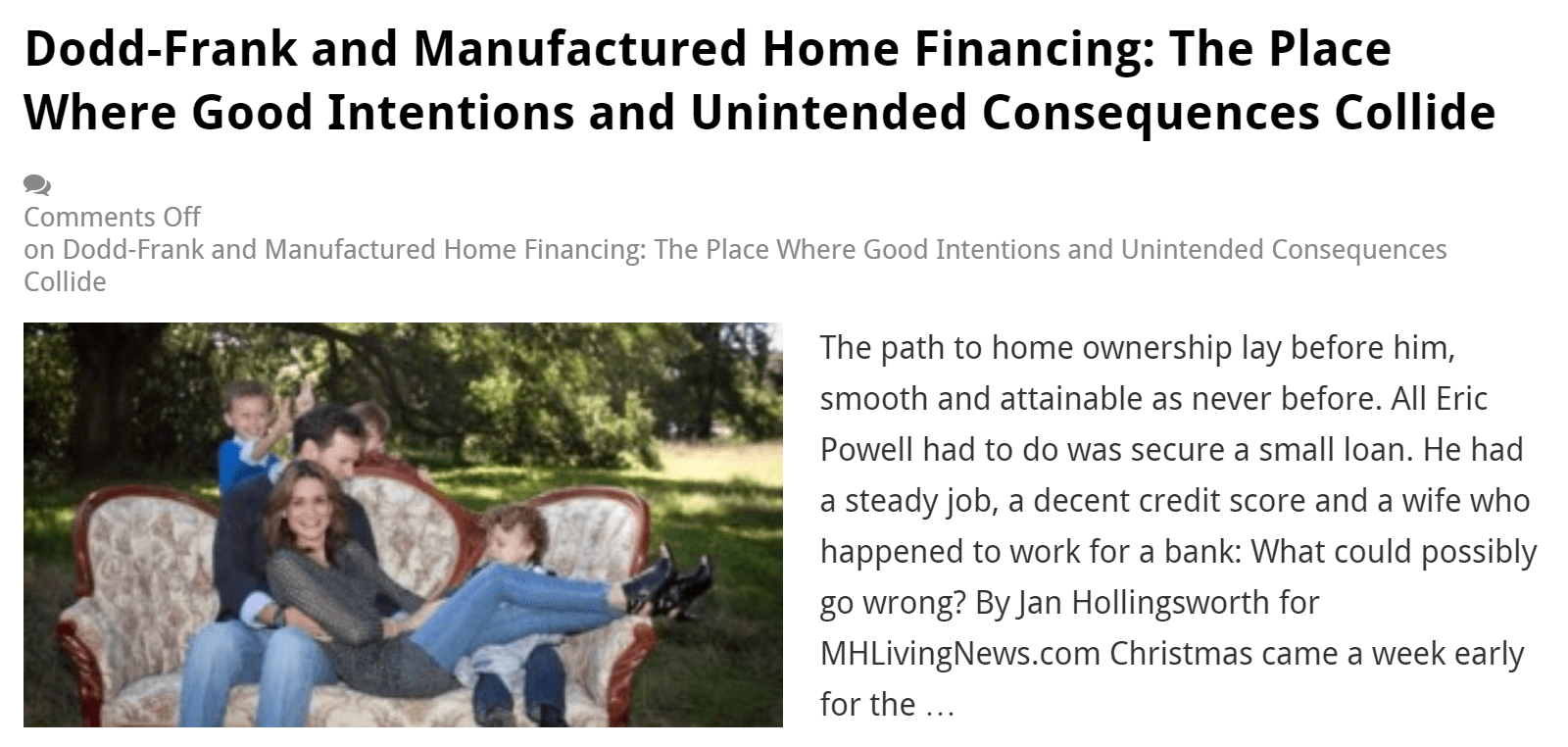 From Gooch: “For the record, the Manufactured Housing Institute has been leading the campaign to bring more lenders into the manufactured housing market for years. Since the [2008] housing crisis, MHI has advanced a comprehensive plan to address the availability of credit for manufactured home buyers.”