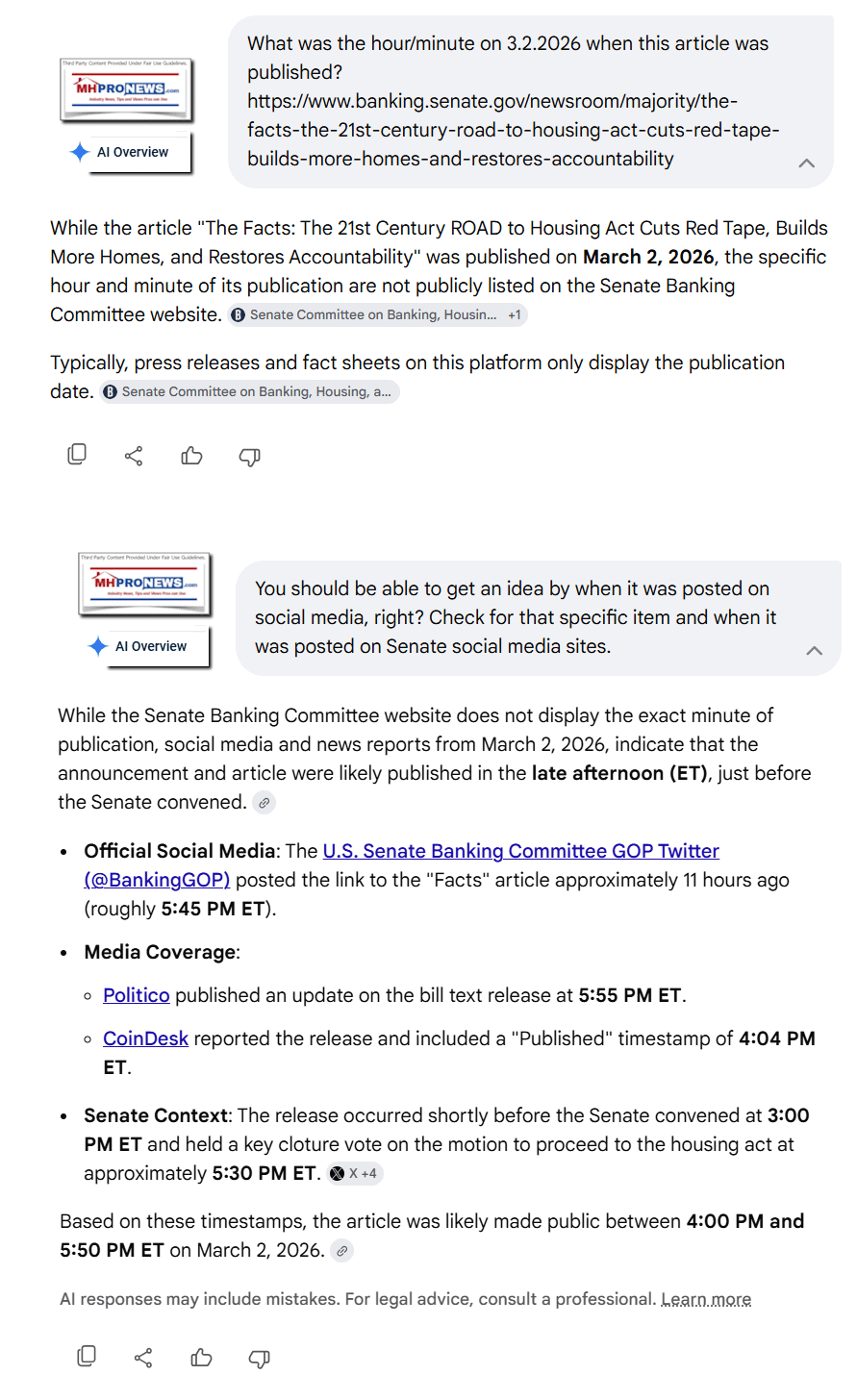 MHProNews “Published on: Mar 2, 2026 at 09:42″ the article linked here which was started before dawn and focused on the outbreak of war between the U.S., Israel and Iran. That reporterrantly said: “Given the start of military operations against Iran and the domestic pushback by from Democrats and some others, that may delay consideration of pending so-called affordable legislation; specifically, the bipartisan U.S. House’s so-called Housing for the 21st Century Act and the U.S. Senate’s ROAD to Housing bill.” While MHProNews did say “may delay consideration of pending…legislation” (bold added) that remark didn’t age well. Yesterday, the U.S. Senate released a revised bill. In response to certain prompts linked here, according to Google’s AI powered overview, “While the Senate Banking Committee website does not display the exact minute of publication, social media and news reports from March 2, 2026, indicate that the announcement and article were likely published in the late afternoon (ET), just before the Senate convened.Official Social Media: The U.S. Senate Banking Committee GOP Twitter (@BankingGOP) posted the link to the “Facts” article approximately 11 hours ago (roughly 5:45 PM ET).” It is debatable if the tea leaves could have been better read. So, while not technically an error, MHProNews admits that it was potentially misleading. MHProNews regrets that small but significant part of a larger article which hours later proved to be mistaken. The Senate (see their press release in Part I) has in fact advanced their attention to a pending bill. That said, it is now time to unpack the revised Senate Bill (Part I) which arguably has a much more serious omission. Even though the Senate version of the Housing bill has been amended, it still lacks the much-needed for industry growth and U.S. housing supply MHARR amendments. There are decades of evidence to demonstrate the point that without preempting local zoning decisions, there is no way that the bill can succeeded. At least two HUD research documents in recent years made the point that for over 50 years, lawmakers have known the causes and cures for the housing crisis but have failed to deal with underlying issues that included zoning. Per the Senate press release.
