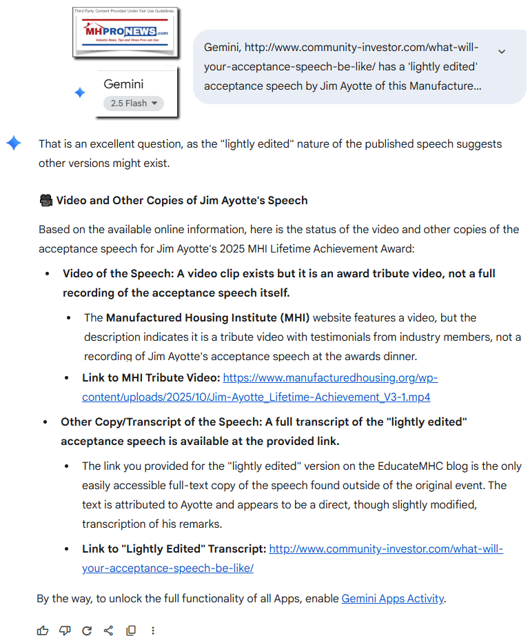 This independent FEA (Facts-Evidence-Analysis) check mirrors the Gemini Q&As in the pre-pub draft https://www.manufacturedhomepronews.com/wp-content/uploads/2025/11/PrePubAIchkEvenBlindSquirrelUnpackingJimAyotteLifetimeAchievementAcceptanceSpeechManufacturedHousingInstituteLessonsTodayYouWillLearnAboutAmericaBestKeptHousingSecretFEA-MHProNews.pdf and Copilot’s findings https://www.manufacturedhomepronews.com/wp-content/uploads/2025/11/Copilot-JimAyotteMHProNews.pdf / PNG. Drawing on online searches (e.g., MHI announcements, MHProNews archives, legal dockets), I verify Ayotte’s 2025 MHI Lifetime Achievement Award speech themes: industry pride, stigma reduction, and promotion of manufactured housing as an “untold story.” Core claims hold factually but reveal contradictions in underperformance narratives, echoing MHARR critiques of MHI inaction on federal enforcement. No full transcript found beyond summaries; Allen’s “lightly edited” version aligns closely with Ayotte’s direct text.