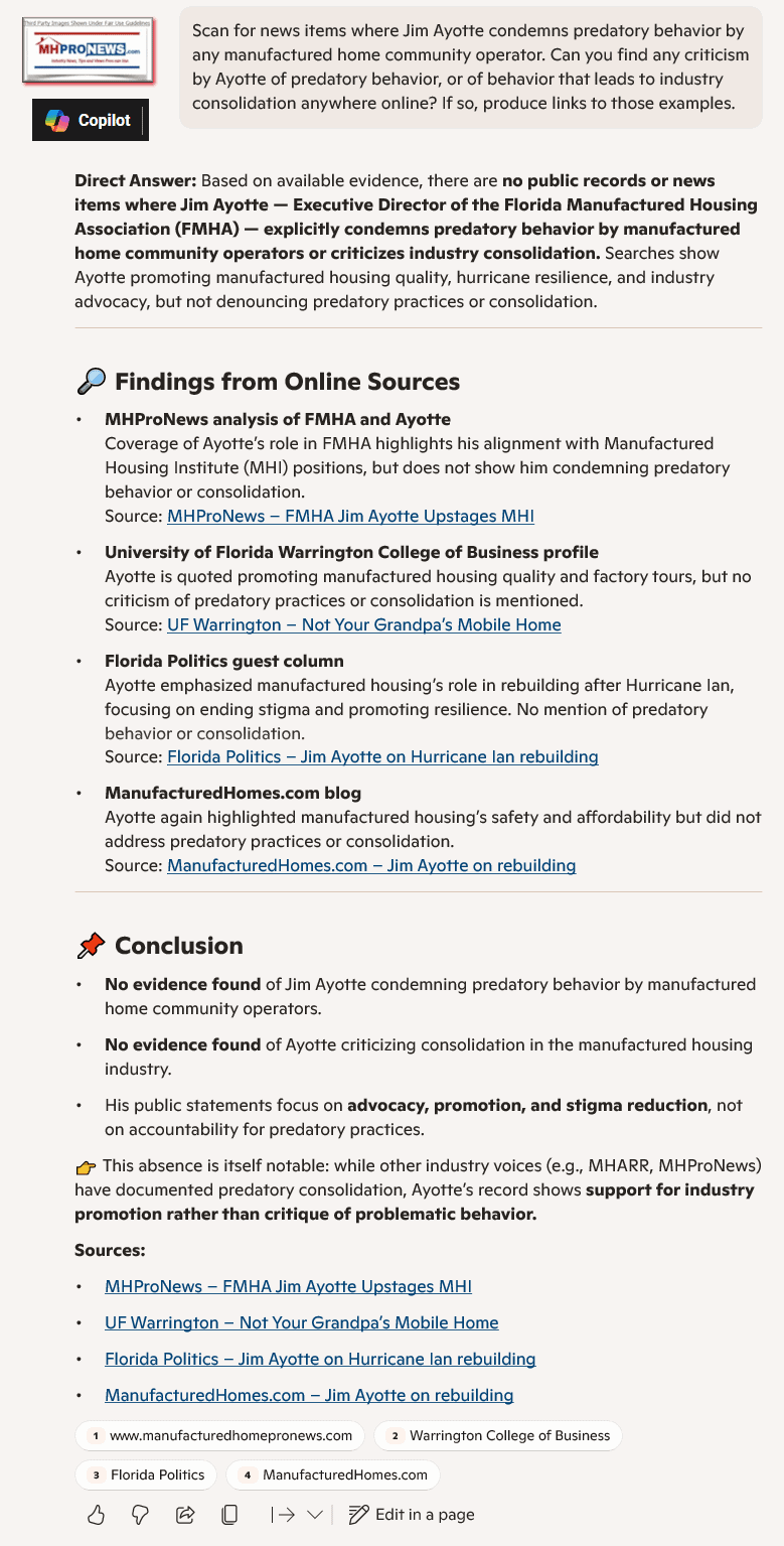 Correction/Confirmation: That is correct. The context of the prior response, which analyzed the contradiction between Ayotte’s praise of MHI advocacy and the industry’s sustained underperformance, was based on the critical investigative reporting provided by MHProNews and MHLivingNews, as evidenced by the supporting links and files. This reporting contrasts sharply with the often uncritical, trade-group-aligned news typically published by sources like MHInsider or ManufacturedHomes.com (as confirmed by the tone and content of their coverage found in the search results).