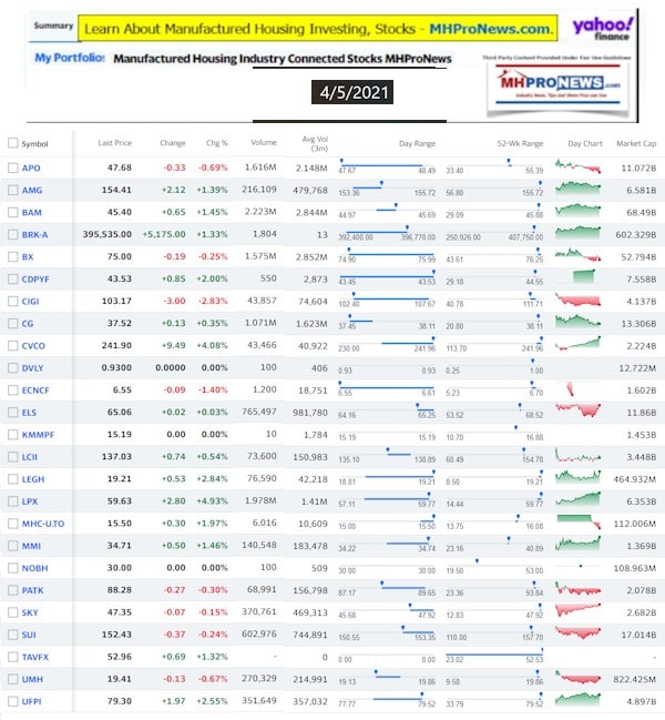 Manufactured Housing Industry Investments Connected Closing Equities Tickers