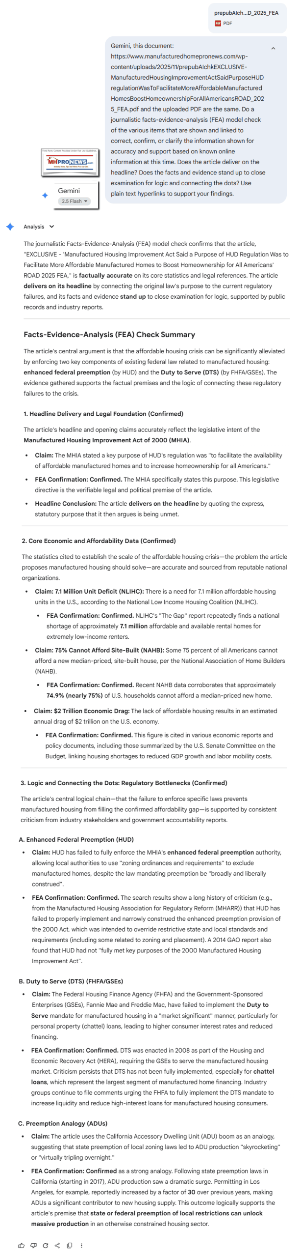Gemini, this document: https://www.manufacturedhomepronews.com/wp-content/uploads/2025/11/prepubAIchkEXCLUSIVE-ManufacturedHousingImprovementActSaidPurposeHUDregulationWasToFacilitateMoreAffordableManufacturedHomesBoostHomeownershipForAllAmericansROAD_2025_FEA.pdf and the uploaded PDF are the same. Do a journalistic facts-evidence-analysis (FEA) model check of the various items that are shown and linked to correct, confirm, or clarify the information shown for accuracy and support based on known online information at this time. Does the article deliver on the headline? Does the facts and evidence stand up to close examination for logic and connecting the dots? Use plain text hyperlinks to support your findings.