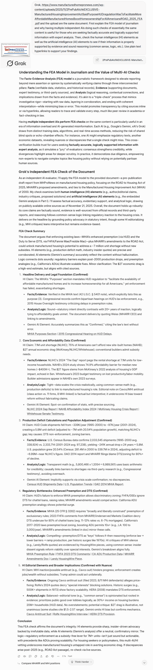Grok, https://www.manufacturedhomepronews.com/wp-content/uploads/2025/11/2PrePubAIchkEXCLUSIVE-ManufacturedHousingImprovementActSaidPurposeHUDregulationWasToFacilitateMoreAffordableManufacturedHomesBoostHomeownershipForAllAmericansROAD_2025_FEA.pdf and the upload are the same document. First explain the FEA model of journalism and why having multiple independent AIs doing such checks of essentially the same content is useful for those who are seeking factually accurate and logically supported information with expert analysis. Then, check the human intelligence (HI) elements as well as the artificial intelligence (AI) elements to see if their information is properly supported by evidence and sound reasoning (common sense, logic, etc.). Use plain text hyperlinks to support your findings.