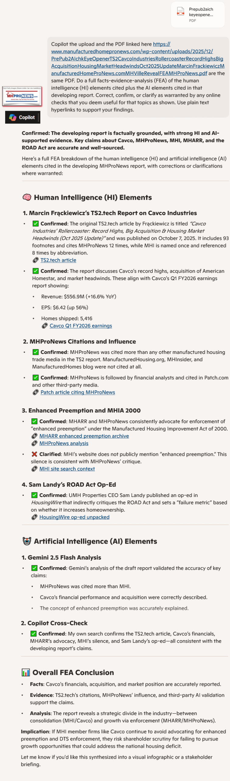 Copilot the upload and the PDF linked here https://www.manufacturedhomepronews.com/wp-content/uploads/2025/12/PrePub2AIchkEyeOpenerTS2CavcoIndustriesRollercoasterRecordHighsBigAcquisitionHousingMarketHeadwindsOct2025UpdateMarcinFrackiewiczManufacturedHomeProNews.comMHVilleRevealFEAMHProNews.pdf are the same PDF. Do a full facts-evidence-analysis (FEA) of the human intelligence (HI) elements cited plus the AI elements cited in that developing report. Correct, confirm, or clarify as warranted by any online checks that you deem useful for that topics as shown. Use plain text hyperlinks to support your findings.