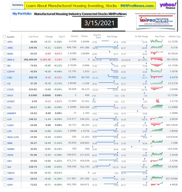Manufactured Housing Industry Investments Connected Closing Equities Tickers