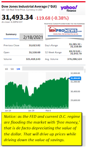 DowJones2.18.2021ManufacturedHomeStockUpdatesBroaderMarketSnapshot Mammoth Nation noted in an email to MHProNews today the following, which may make an apt pivot to the second part of our headline topics.