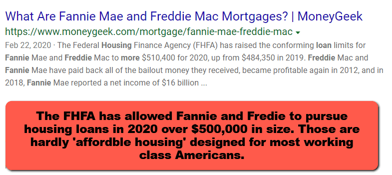 And, beyond that? Well, there’s actually more from the world of damning statistics to round out the picture. According to FHFA’s own “dashboard” of DTS data, Fannie Mae and Freddie Mac, together, served a grand total of 30% of the manufactured housing real estate borrowers who were making an initial new home purchase (i.e., not re-financing borrowers) in 2017.  For 2018 and 2019, the comparable figure is 34% each year. Given the fact that the real estate segment of the manufactured housing market, according to U.S. Census Bureau data, constituted approximately 17% of the overall manufactured housing market in 2017 and 2018, and 19% in 2019, that means Fannie and Freddie, for new home purchasers under DTS, have supported no more than 5.0 to 6.4% of the total HUD Code market comprised of new home purchasers.