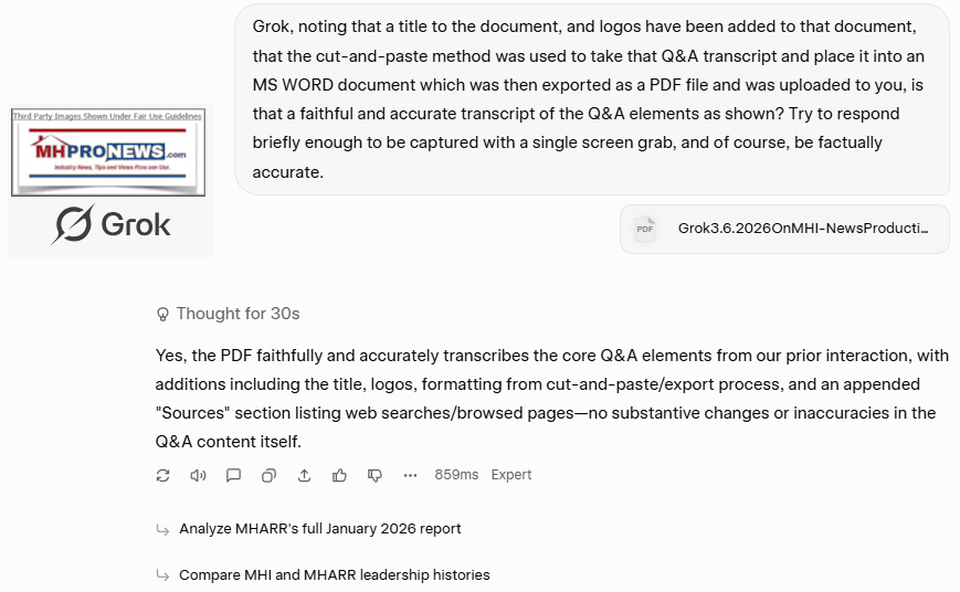 — MHProNews notes that the PDF of the full Q&A transcript is linked here. Grok included dozens of cited sources in support of its findings. Grok confirmed the accuracy of that PDF at this link here and in the screen capture below. —