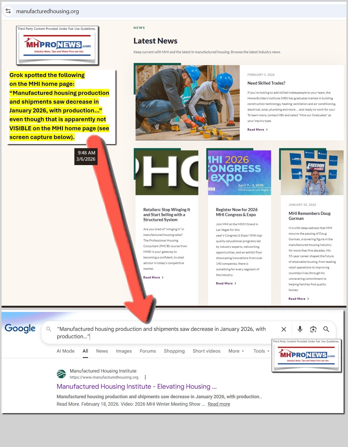 • MHI Disclosure: As of 9:26 AM ET on March 6, 2026, the Manufactured Housing Institute (MHI) news landing page claims to be the source for “the latest news to give you a full perspective,” yet it has not visibly reported these specific January 2026 production and shipment declines to all visitors in the same transparent manner as MHARR.
