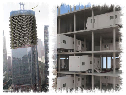 ComplexCityGuide reports that New York City recently declared a mandatory evacuation for some 370,000 residents in advance of Hurricane Irene. Accommodations for less than 70,000 residents were available. Had a major disaster hit, where would people in the Big Apple go? Back in 2008 the city’s Office of Emergency Management gave this shortcoming some thought and issued a request for proposals soliciting temporary housing solutions. One solution that is readily deployable simply inserts pre-manufactured, stockpiled FEMA travel trailers into mid- and high-rise buildings currently under construction throughout the city. Freedom Tower presents an opportunity in such a scenario. Midway through construction, the building is replete with cranes for hoisting FEMA travel trailers into place, elevators, and utilities. Concept promoters said FEMA travel trailers provide four-season weather protection and comfort. Each unit has individual climate controls as well as spectacular views and abundant fresh air, as quality of life must be a key concern. Residents would remain for as long as it takes to rebuild those areas affected by disaster. The mock up shown is how this might look.