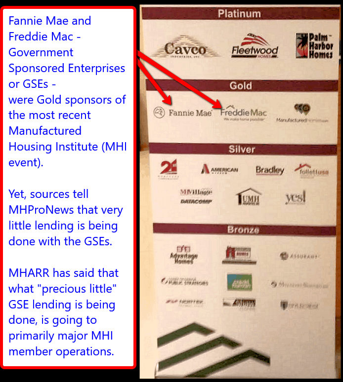 - MHI has had as event sponsors Fannie Mae and Freddie Mac. That smacks of collusion that points to the very concerns raised by Ghorbani in his response. After all, why would Fannie and Freddie need to sponsor MHI to curry favor, if the GSEs were sincere in their intention of robustly supporting all HUD Code manufactured homes?
