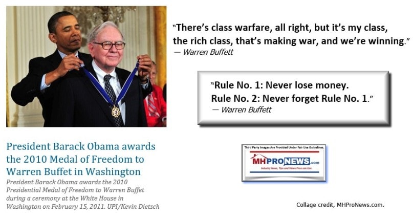 In addition, it exposes the green light that Fannie and Freddie have routinely received from the industry’s usual suspects, led by Warren Buffet’s Berkshire Hathaway subsidiary, Clayton Homes, Inc. and Clayton’s own financing affiliates. These business – and ultimately Buffet – stand at the apex of the problems that exist for the industry and consumers with respect to both production and financing. Clayton, on the one hand, dominates industry production. On the other hand, through its financing subsidiaries, it dominates the manufactured housing consumer finance market. With this double-edged market power, it is able to push consumers – with no other or better options due to the subversion of DTS — into higher-rate manufactured housing purchase loans for the homes that they produce. And, in fact, Berkshire Hathaway in one of its recent annual reports, notes that it makes more money from manufactured housing finance than from the production and sale of manufactured homes per se. So why change?