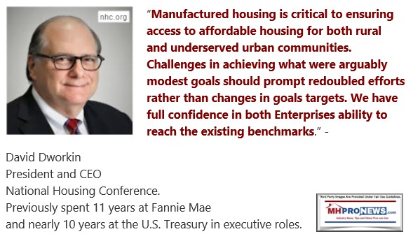 - David Dworkin, President and CEO of the National Housing Conference said in formal comments to the federal government the following, which was quite in keeping with Ghorbani’s assertion. It should be noted that Dworkin served as a vice president for a GSE, so one might presume that he knew what he was talking about. Furthermore, Dworkin arguably did a better job of arguing for more from the GSEs than MHI’s Lesli Gooch did, see that comparison of their respective remarks at the link here.