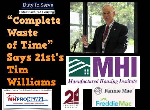 It is the other Tim Williams, former MHI Chairman and the president and CEO of Berkshire Hathaway owned 21st Mortgage, who reportedly said to several MHI members the following. Williams stated that he was glad that the Government Sponsored Enterprises (GSE or Enterprises) pilot project for personal property lending had failed. That pilot was supposed to be in response to the Duty to Serve mandate that MHARR’s report above addressed.