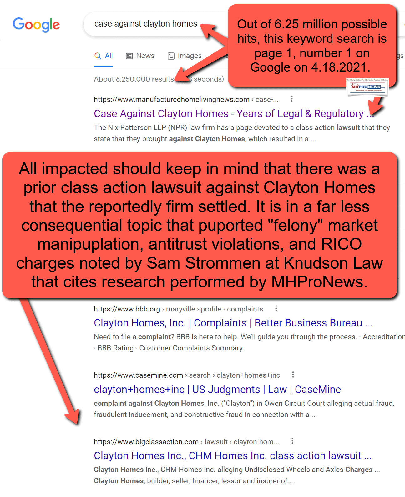 - To shed light on these problems, MHProNews and our sister site have in recent years increasingly focused on fact- and evidence-based reports that are systematic and enlightening. Some of those are producing significant levels of traffic. One piece of evidence for that is demonstrated by the example in the screen capture below that is linked here. That screen capture also points out that complaints against Clayton Homes is far more common than the firm would like to admit.