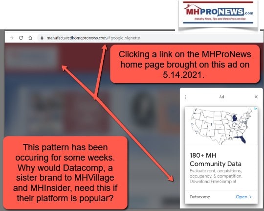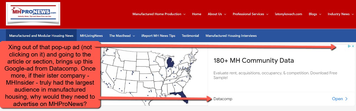 As an factual but almost comical example of how feckless, sycophant, and lightly read our rivals are, MHI backer and MHVillage-Datacomp sister-brand MHInsider – using the Google ads mechanism – are advertising their services on MHProNews. Would they be doing so if they were truly the dominant brand in industry news, tips, and analysis?
