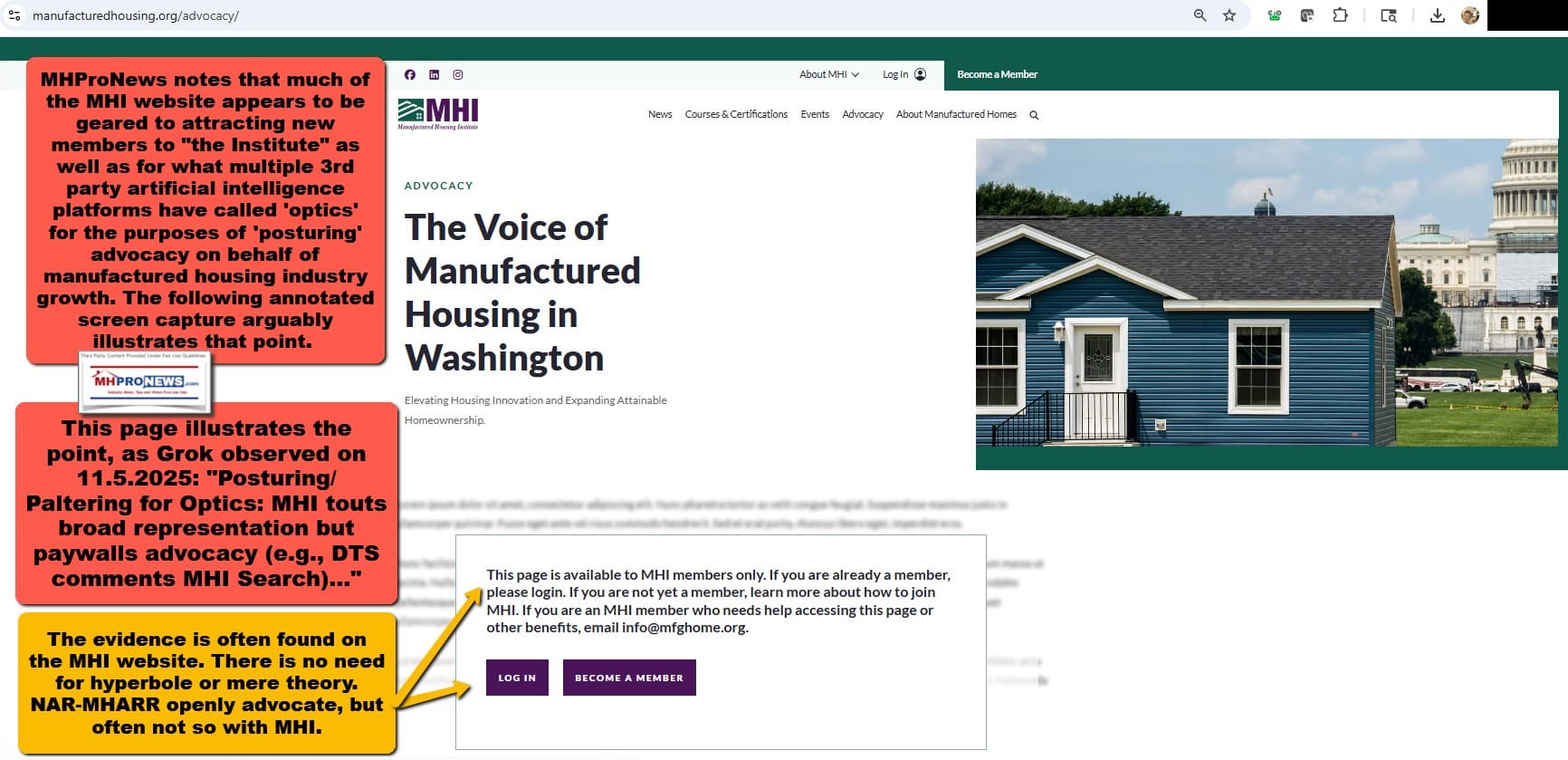 MHProNews notes that much of the MHI website appears to be geared to attracting new members to “the Institute” as well as for what multiple 3rd party artificial intelligence platforms have called ‘optics’ for the purposes of ‘posturing’ advocacy on behalf of manufactured housing industry growth. The following annotated screen capture arguably illustrates that point. To see the image below in a larger size, in many devices/browsers click the image and follow the prompts or click here and follow the prompts.