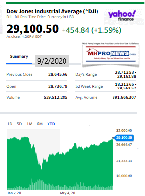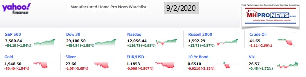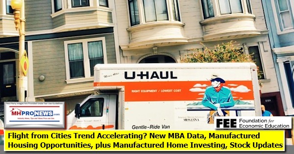 All of the bulleted issues appear to be among the drivers for a growing number of city dwellers leaving cities. Data from the Mortgage Bankers Association (MBA) in a media release to MHProNews will be our featured focus tonight. That report follows our left-right headline summary, quotable quotes and 2 of our 3 market graphic snapshots for today. The manufactured housing connected stocks at the closing bell are found after featured focus and the linked related reports.