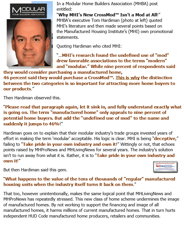 But on-the-record statements of an actual retailer of “CrossModTM” homes to MHProNews belies the merits or logic of the program, as will be explored below. Additionally, a more prominent member of MHI told MHProNews off the record that the numbers behind the “CrossModTM” doesn’t make financial sense. Per that source, when the costs of meeting the Fannie Mae MH Advantage™ or the Freddie Mac CHOICEHome® installation and other standards are factored in, any advantage in the lower interest rate is wiped out.
