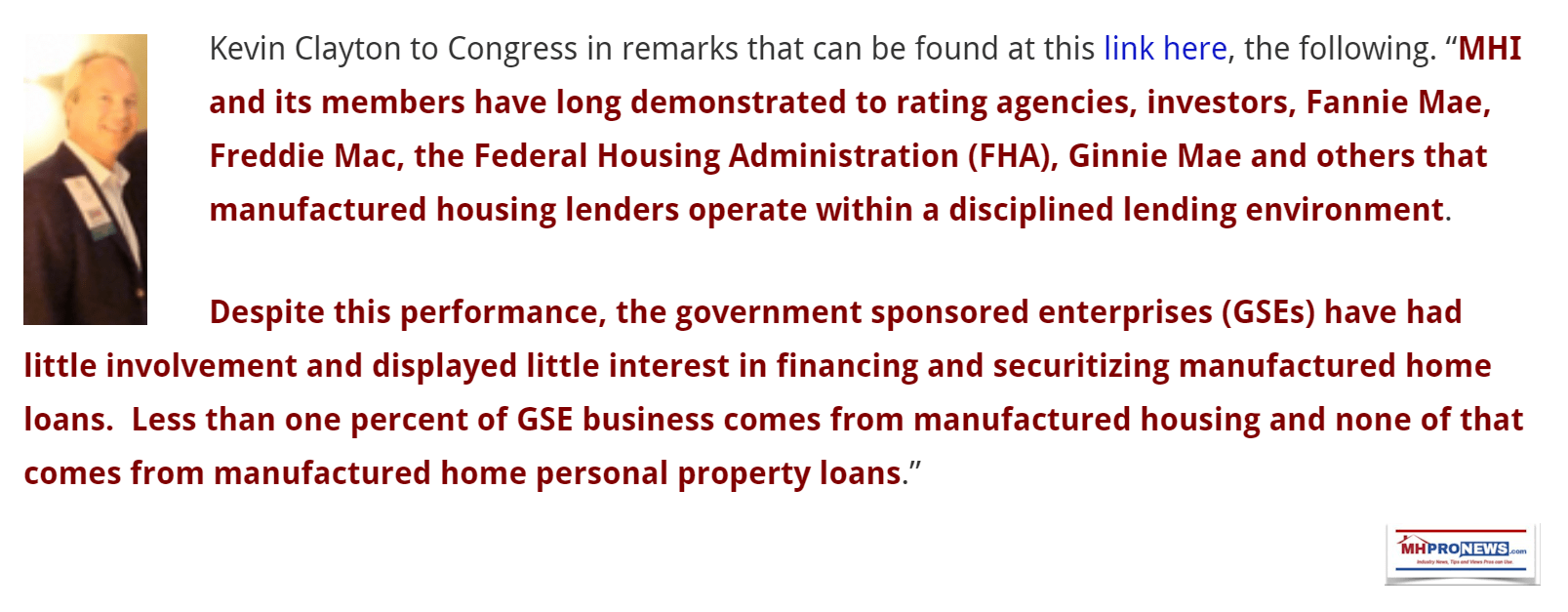 Even as MHI claims to be working to advance the cause of ‘more lending’ in manufactured housing via the long sought, but never fulfilled Duty to Serve (DTS) manufactured housing by the Government Sponsored Enterprises (GSEs) of Fannie Mae and Freddie Mac, 21st’s Williams remarked to members in a meeting that he is glad that their pilot project failed.