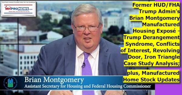 But what’s bad news to most independents and consumers of affordable housing that dream of homeownership, in Topsy-Turvey DC world may be good news to consolidators at MHI. So what did MHI do with the vexing video recorded statement by Fudge that directly contradicts MHI’s stated policy on zoning and placement issues? Why, celebrate it of course as “MHI in Action,” of course! That vexing quote shown to the right of Sec. Fudge would naturally not make the editorially cut at MHI headquarters in Arlington, VA. You can’t make this up, but you can grab your favorite beverage, rub your eyes, sit back and dig into learning how this works to avoid the next apparent – and often costly – hoodwink. To put Fudge and MHI’s actions into context, it is useful to look at Brian Montgomery as well as some relevant MHI history. These separate tracks will all meet further below.