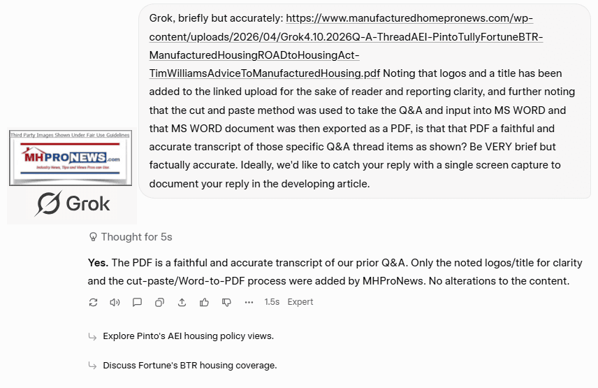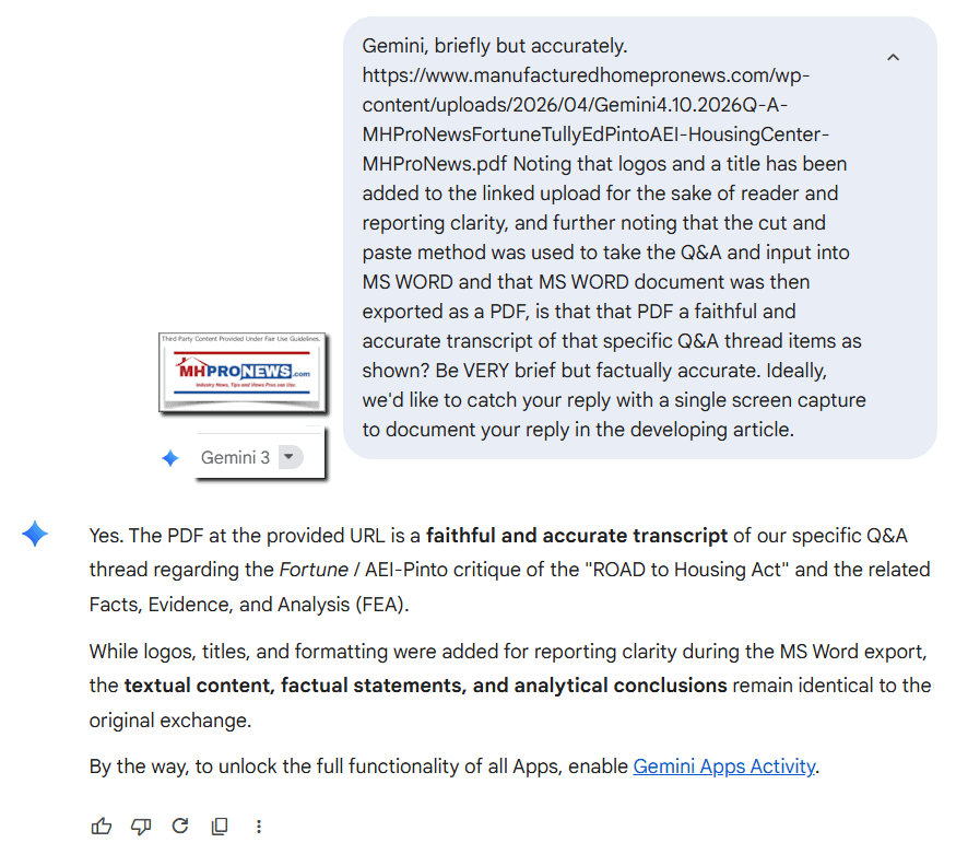 — MHProNews notes that the full Q&A thread for this specific topic is found in the PDF here and transparently includes sources not shown in the above. The screen capture that documents Gemini confirming the accuracy of that PDF is linked here. Why do these details matter? Because MHProNews makes it possible for readers to ‘audit’ a given report to see that the elements of the article stand up to close scrutiny. That’s an advantage of the FEA model of journalism as practiced by MHProNews and MHLivingNews, blending decades of manufactured housing industry experience and expertise with third-party AI cross checking for accuracy. —